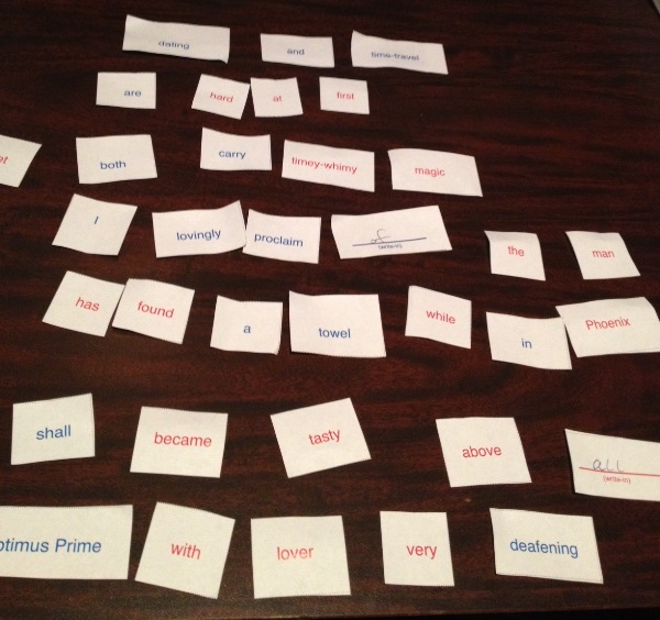 I made my way to the bar and headed upstairs. The room was bright and full of chatter that I tried to block out as one of the hosts explained how the evening would go. First up was icebreaker time – everyone received a couple dozen slips of paper filled with a variety of words. Our mission? Pair up with someone of the opposite sex and use your words to form a line of Valentine’s-related poetry (think poetry magnets that you used to have on your fridge).